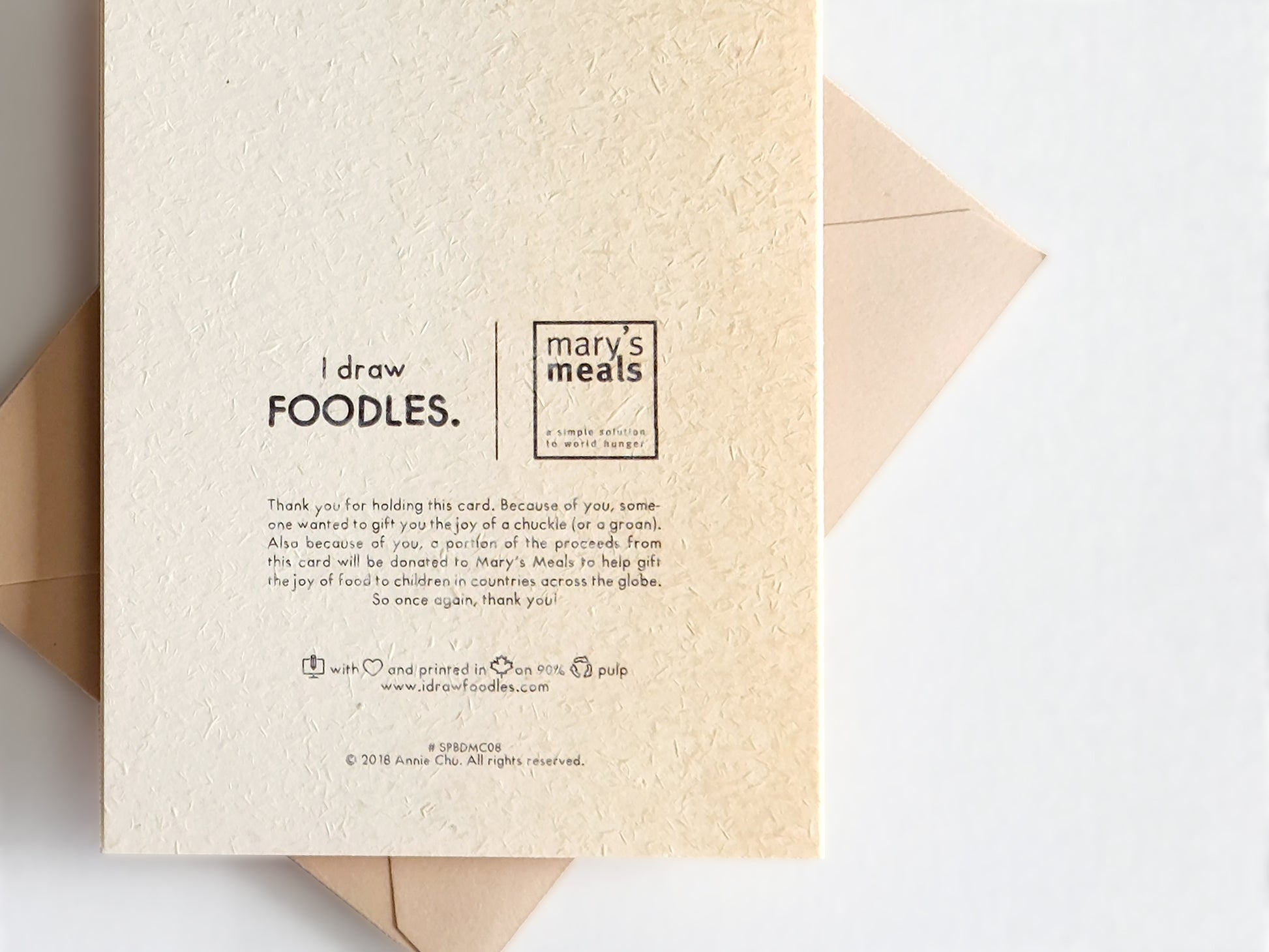 Our punny greeting cards are like a burst of joy wrapped in humor! When you send one of our cards, you're not just giving a witty greeting – you're also contributing to a great cause. A portion of every purchase goes to Mary's Meals, helping bring the joy of food to children worldwide. Let's combat hunger together, one meal at a time! 🌍💚